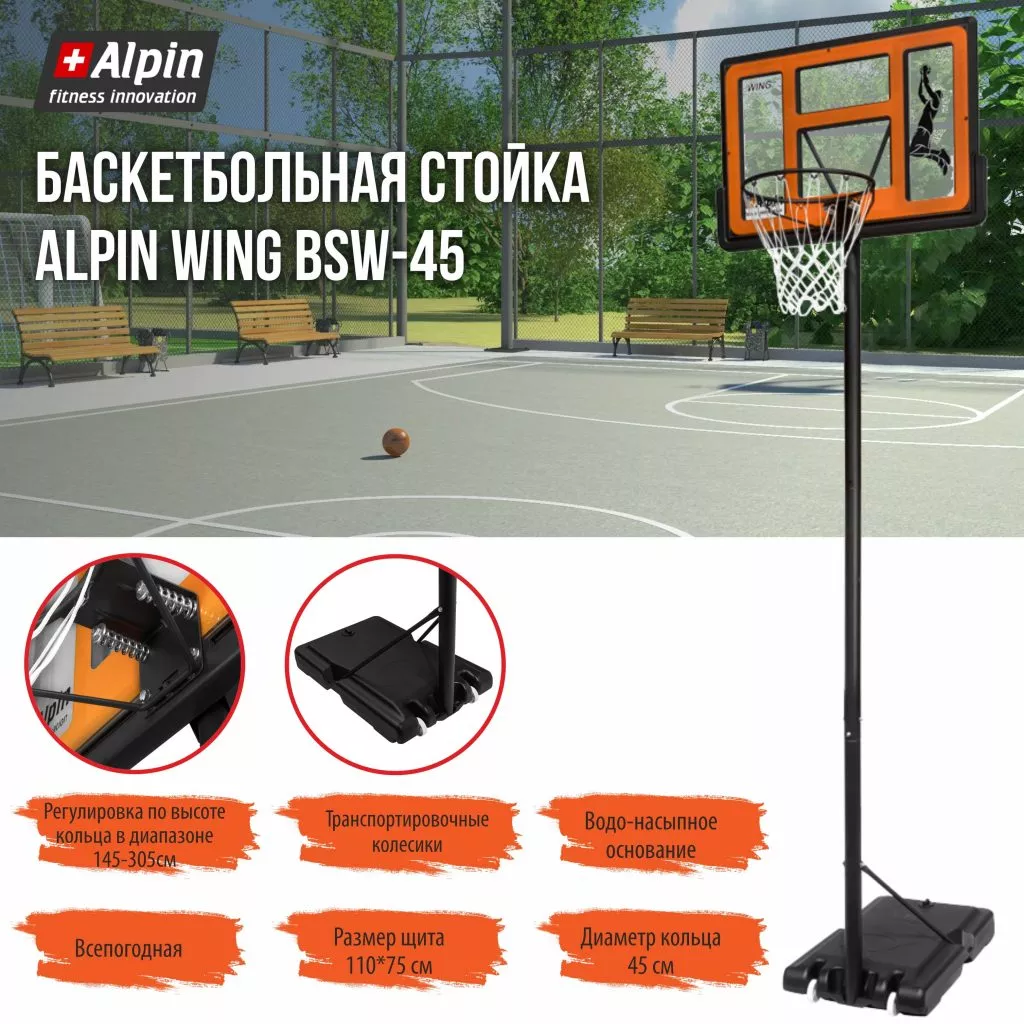 Мобильная баскетбольная стойка Alpin Wing BSW-45 отличный вариант для любительской игры в баскетбол и стритбол на улице. Стойка изготовлена из качественных материалов и имеет регулировку щита по высоте от 145см до 305см. Щит изготовлен из высококачественного поликарбоната и имеет основу с ребрами жесткости. Размеры щита составляют 110*75см. В основание стойки интегрированы транспортировочные колесики, которые позволят вам перемещать стойку. Размер баскетбольного кольца составляет диаметр 45см. и имеет амортизационное крепление. Водоналивное основание наполняется песком или водой, что обеспечивает устойчивость конструкции.