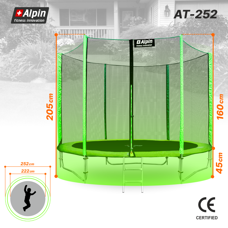 Батут с сеткой и лестницей ALPIN 8ft (252 см.) имеет улучшенную конструкцию рамы и современный дизайн. В конструкции данного батута все продумано до мелочей. Инженеры и дизайнеры ALPIN постарались найти наилучшее решение для Вас. Надежность конструкции обеспечивается прочной рамой с полимерным двусторонним покрытием, нанесенным методом холодной гальванизации.