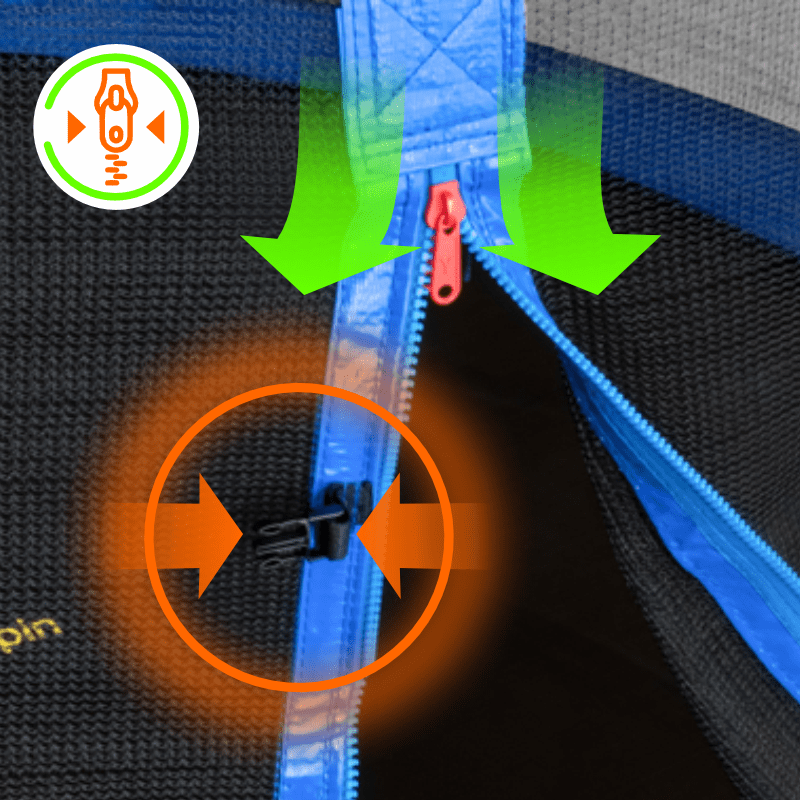 • Специально разработанная конструкция легкого входа и выхода с батута. Замок-молния позволит Вам с легкостью попасть на батут. Дополнительная защита с внешней стороны от открывания, не позволит ребенку самостоятельно покинуть батут без помощи взрослого. Что исключает опасность получения травмы при падении с батута.