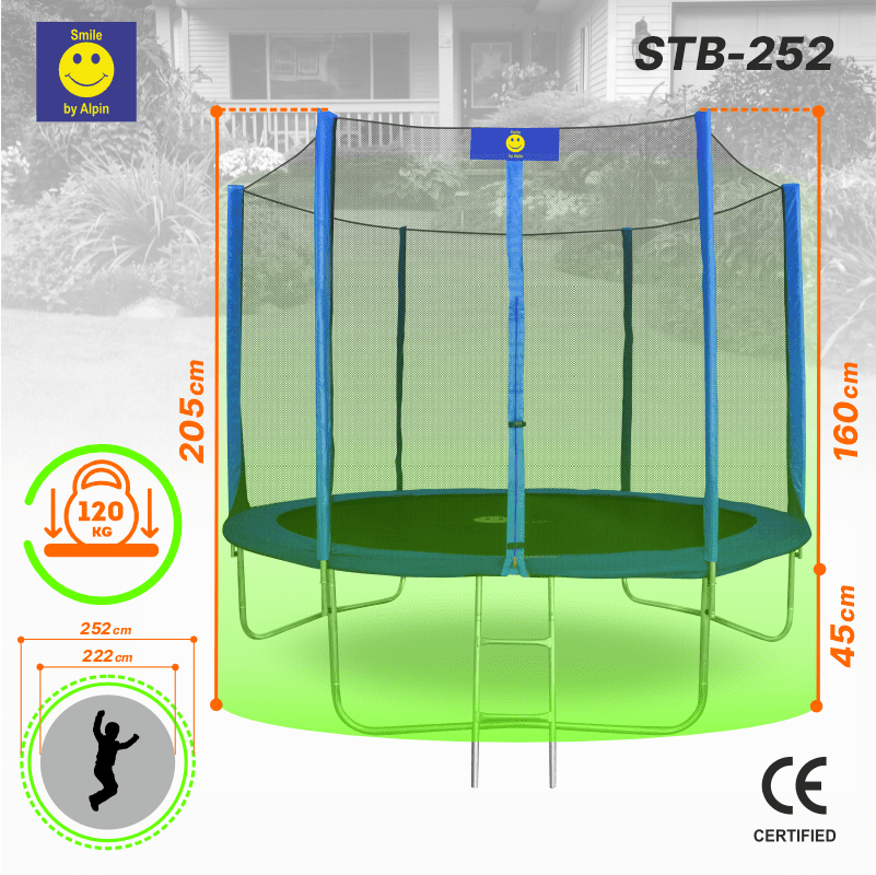 Батут с сеткой и лестницей Smile STB-252 8ft (252 см.) имеет улучшенную конструкцию рамы и современный дизайн. В конструкции данного батута все продумано до мелочей. Инженеры и дизайнеры ALPIN постарались найти наилучшее решение для Вас. Надежность конструкции обеспечивается прочной рамой с полимерным двусторонним покрытием, нанесенным методом холодной гальванизации.