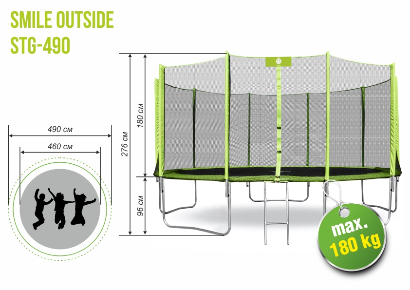Батут с сеткой и лестницей Smile 16ft (490 см.) рассчитан на максимальную безопасность и нагрузку до 180кг. Защитный кожух батута выполнен из высококачественного материала PVC, который устойчив к воздействию солнечных лучей, а увеличенная толщина защитного кожуха обеспечивает дополнительную безопасность. Прыжковое полотно изготовлено из высококачественного материала Перматрон (Permatron, США) - качество высшей категории, проверенное временем на устойчивость к ультрафиолетовым лучам. Данный материал обеспечивает превосходные прыжковые качества батута.
