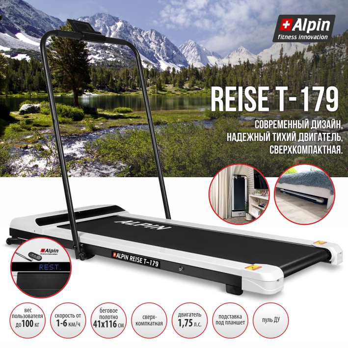 Одной из самых важных особенностей беговой дорожки Alpin Reise T-179 является её компактность (высота тренажера составляет всего 15 см). Эту беговую дорожку вы без труда сможете разместить под кроватью или поставить за шторы, в случае необходимости проведения тренировки, просто достаньте дорожку - проведите тренировку и снова уберите тренажер.