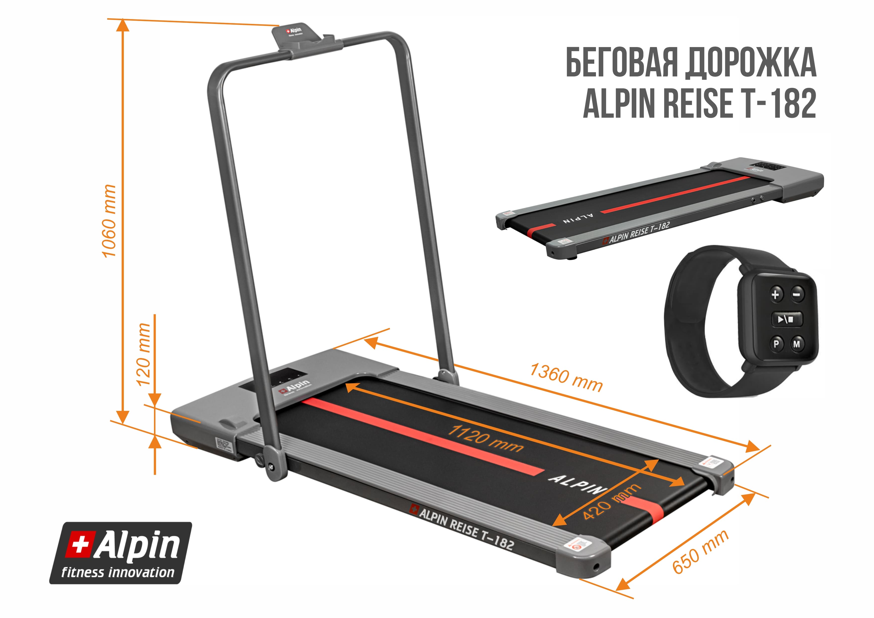 Одной из самых важных особенностей беговой дорожки Alpin Reise T-182 является её компактность (высота тренажера составляет всего 12 см). Эту беговую дорожку вы без труда сможете разместить под кроватью или поставить за шторы, в случае необходимости проведения тренировки, просто достаньте дорожку - проведите тренировку и снова уберите тренажер.