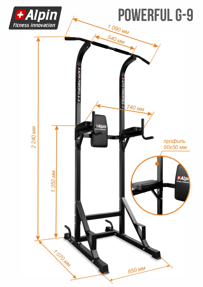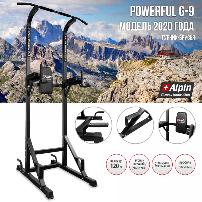 Турник-брусья Alpin POWERFUL G-9 включает в себя пресс, брусья, уголок, турник, рукоятки для отжимания. Турник-брусья позволяет выполнять подтягивания для развития спины и рук, отжимания для груди и трицепсов, тренировать пресс, а также другие упражнения. Комфортная мягкая подушка спины имеет удобную форму и рамзмеры 40*22см. Высокопрочная стальная рама состоит из квадратного квадратного профиля 50*50 мм. и выдерживает вес пользователя до 120 кг.