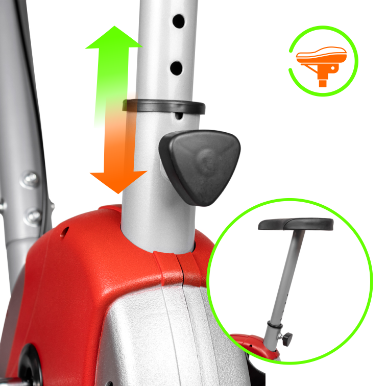 Малогабаритный надежный велотренажер с ременной системой нагружения. Сидение имеет регулировку по вертикали и вместе с возможностью регулировки руля позволяет подобрать оптимальное положение для пользователей различного роста. Хромированный шатун не только защищает поверхность от царапин, но и придает тренажеру большую внешнюю эффектность. За показатели пульса отвечают вмонтированные в рукоятки сенсорные датчики пульса.