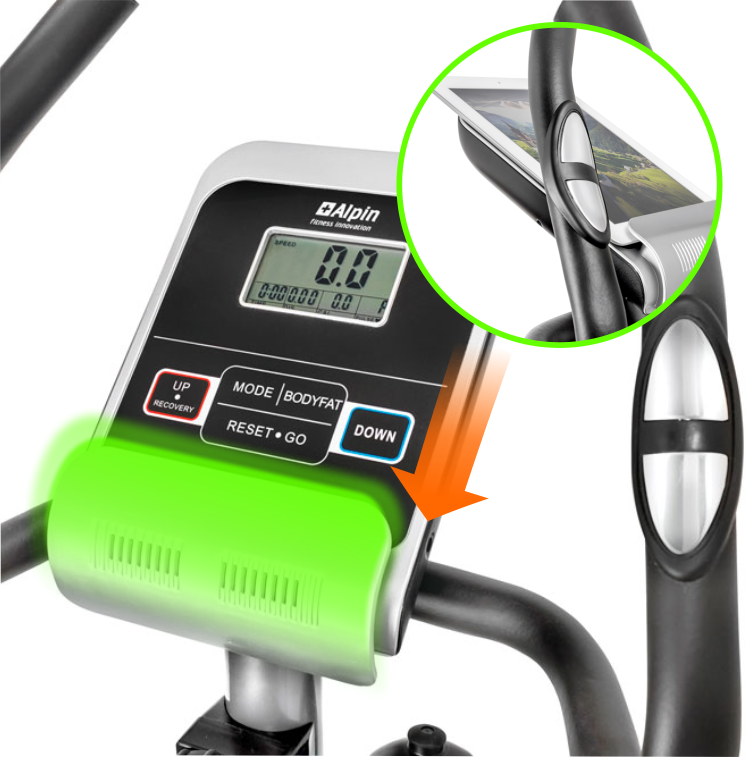 Черно-белый LCD-дисплей с подставкой под смартфон или планшет одновременно выводит на экран различные параметры тренировки - время, дистанцию, скорость, калории, обороты в мин., пульс. Помимо этого, здесь предусмотрена функция фитнес-теста (Recovery) - она позволяет быстро оценивать тренированность человека и определять, насколько хорошо развита его сердечно-сосудистая и дыхательная системы.